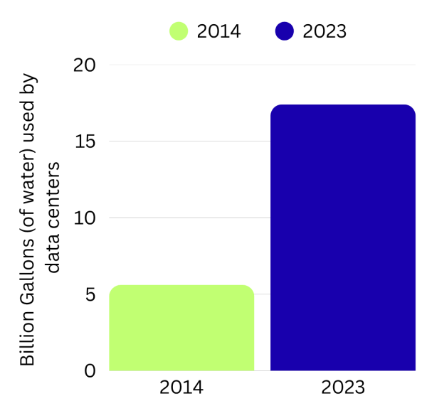 In an article from Stanford University, an Energy Department report noted that in 2014, U.S. data centers used 5.6 billion gallons of water. By 2023, 84% of the water was used to run the larger “hyperscale” centers, and the total water use had tripled to 17.4 billion gallons per year.